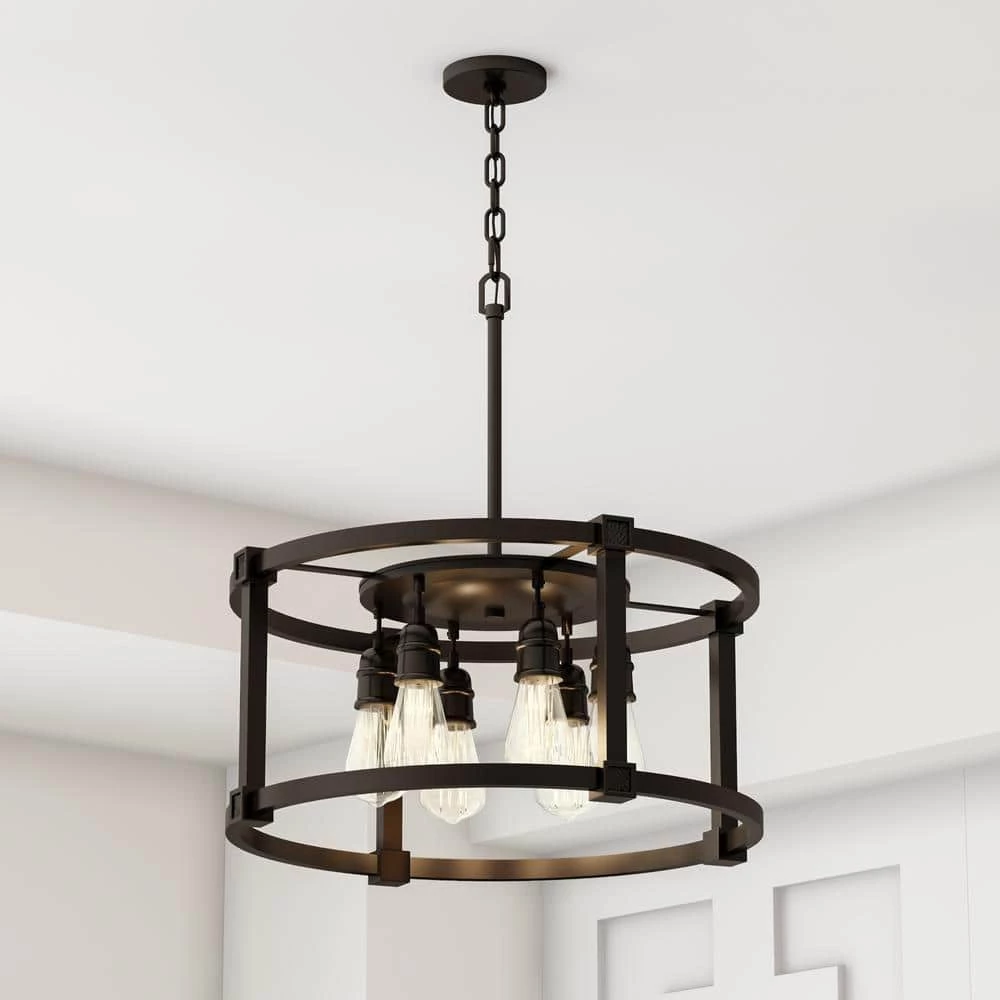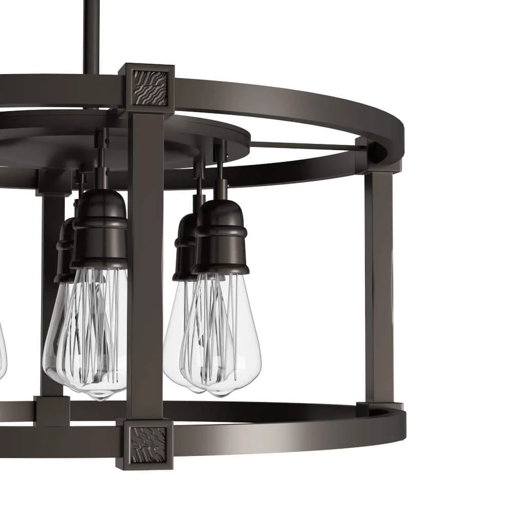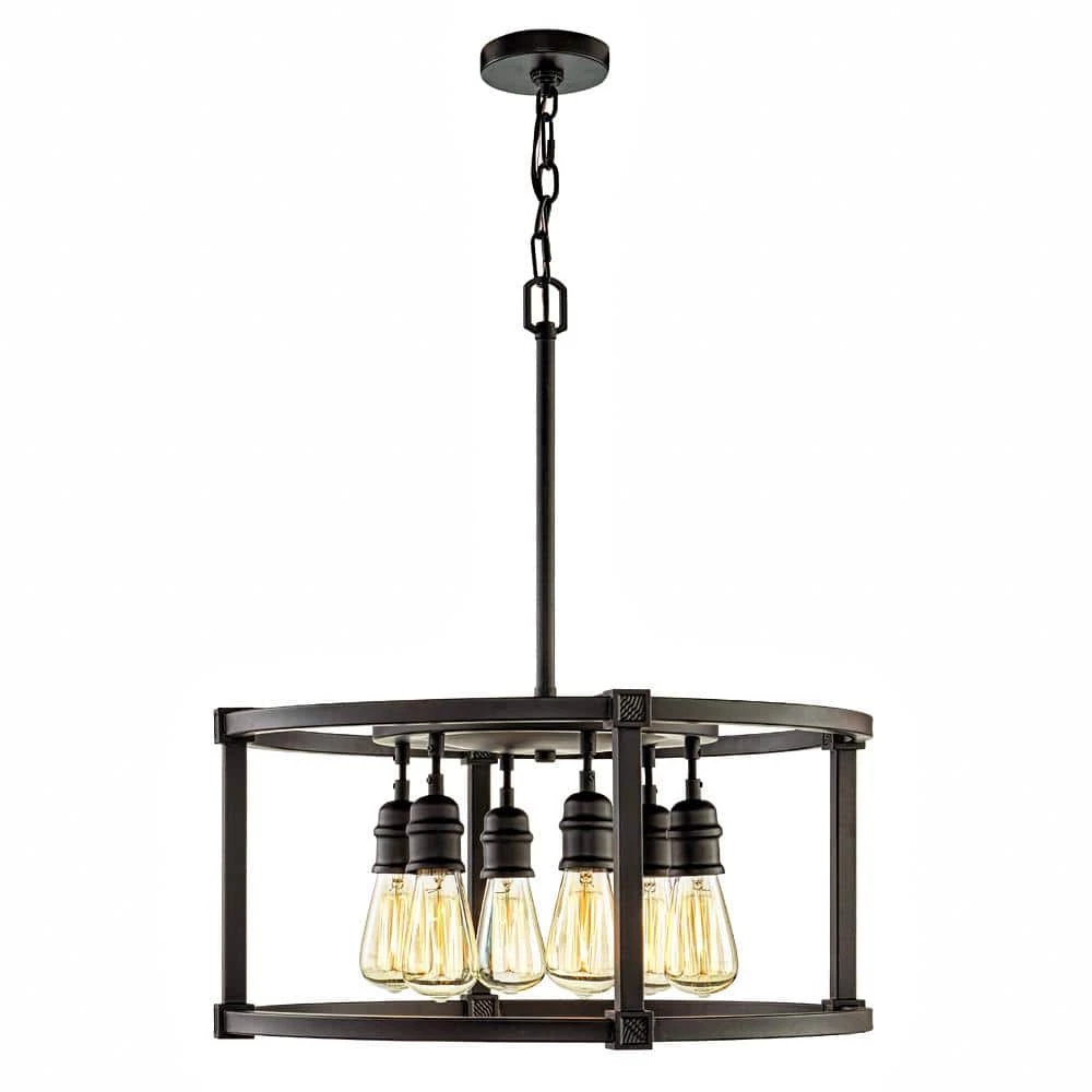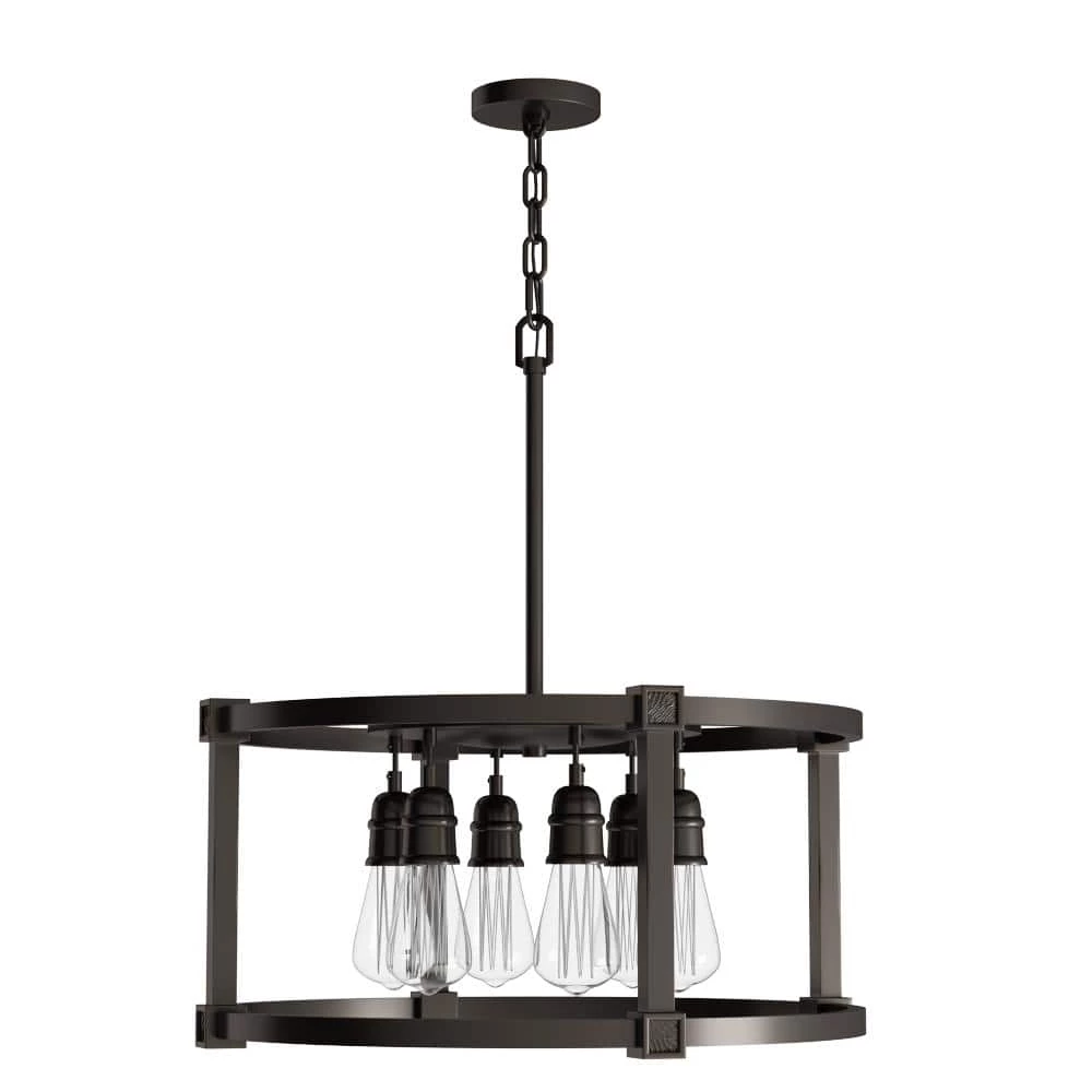 Don’t be fooled by this simple looking Romaro Row 6-light dinette. Sometimes simple is more difficult to manufacture than an extravagant chandelier. The Aged Bronze finish highlights the quality of the frame and the precision of the construction. The early electric bulbs make this the ideal restoration inspired pendant.
