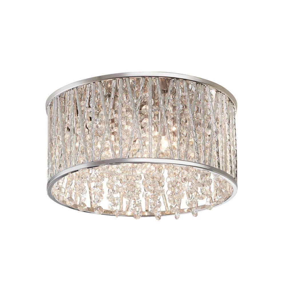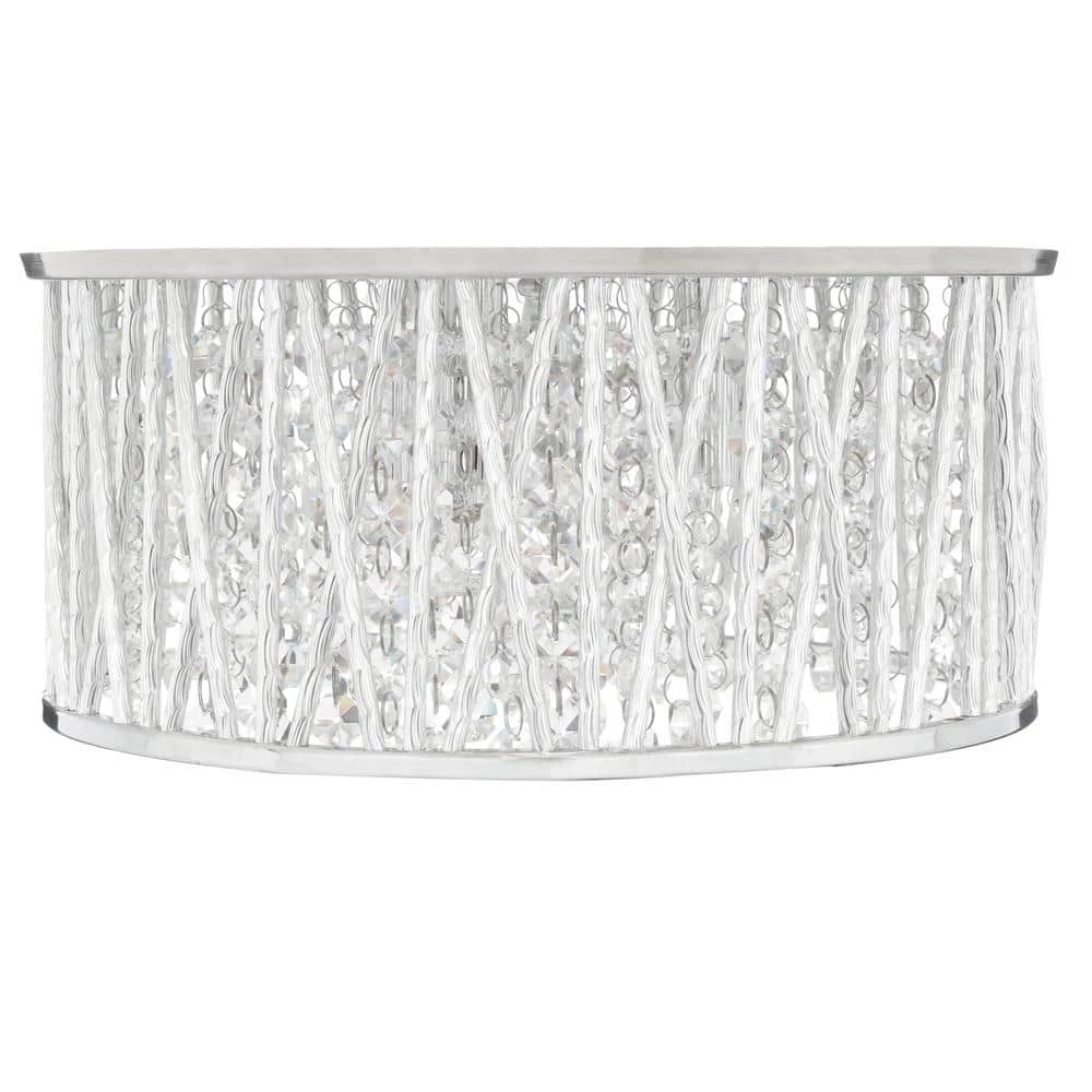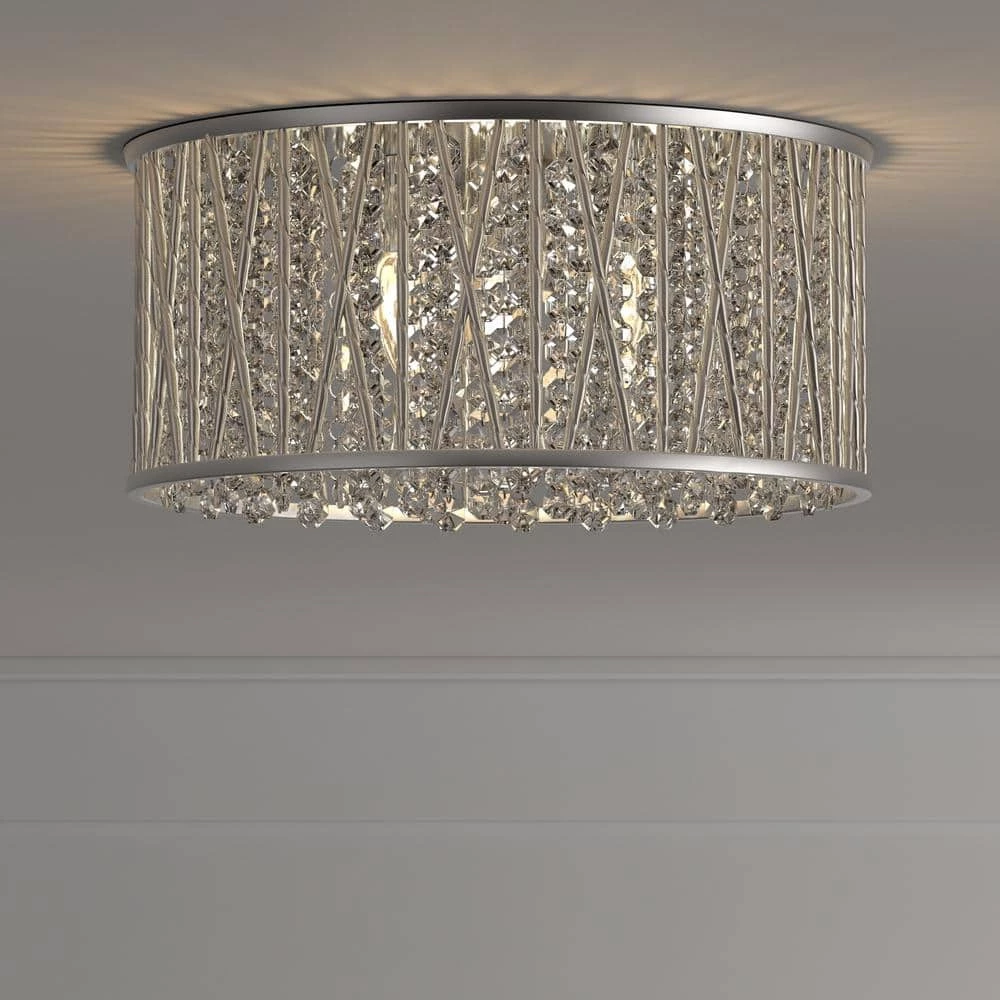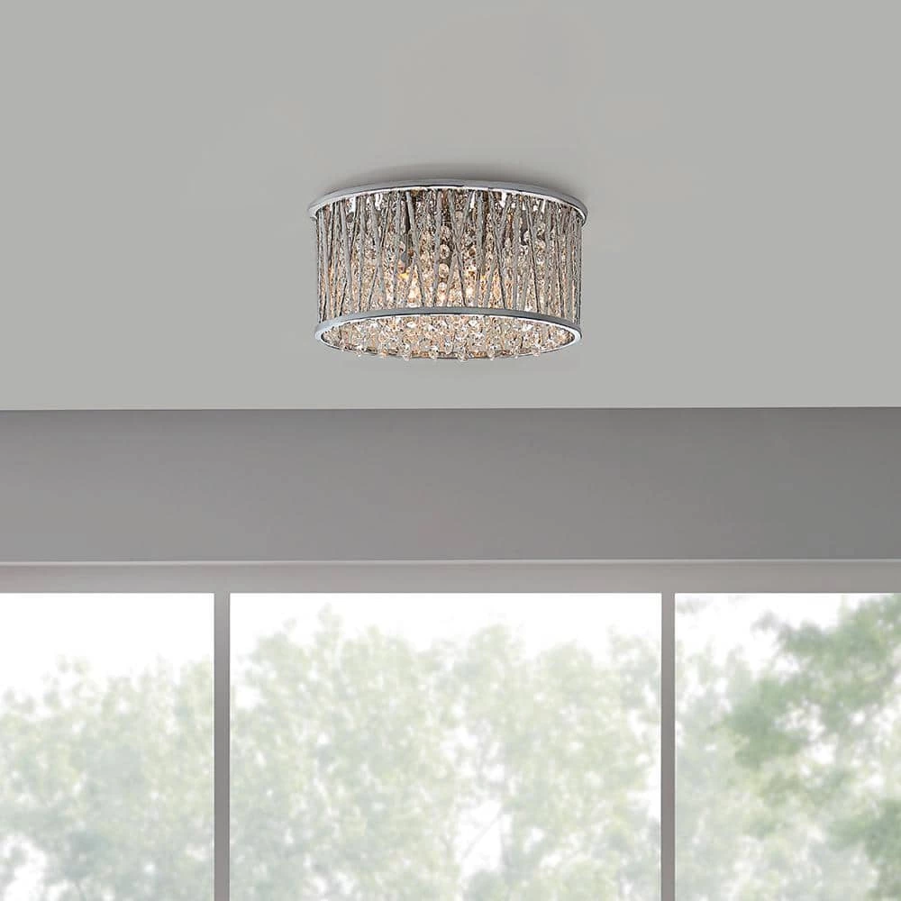 The Saynsberry Collection combines elegance with modern styling to exhibit beautiful, showstopping indoor pieces. The Saynsberry 11.5 inch flush mount light is featured in a sleek, polished chrome finish complimented by a crystal beaded drum shade. The mirrored ceiling plate inside the shade blends brilliant reflections to enhance the color refracted from the crystal beads. This flush mount uses three bulbs, and outputs ample lighting for use in bedrooms, living rooms, home offices, and more. The Saynsberry Collection also offers a matching chrome and crystal drum shaped pendant.