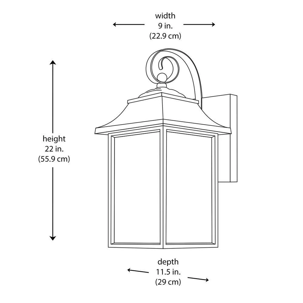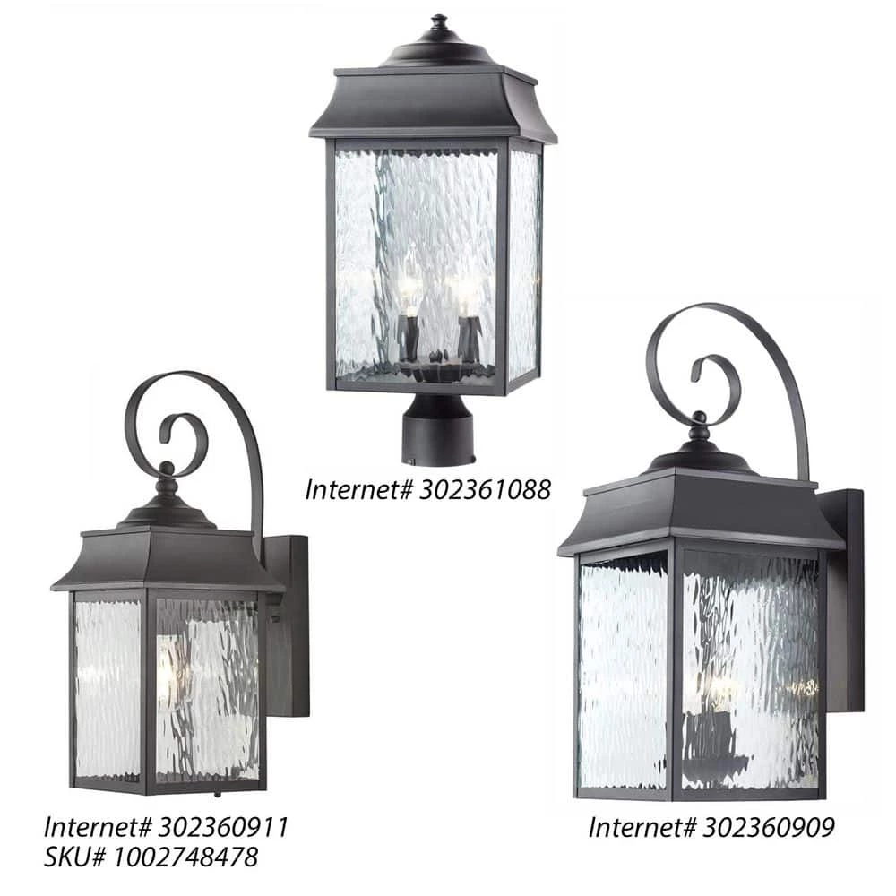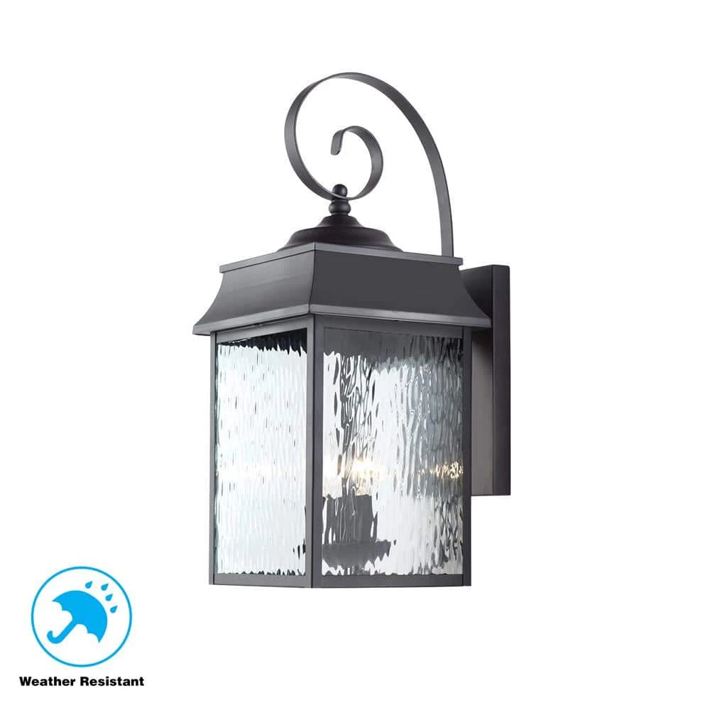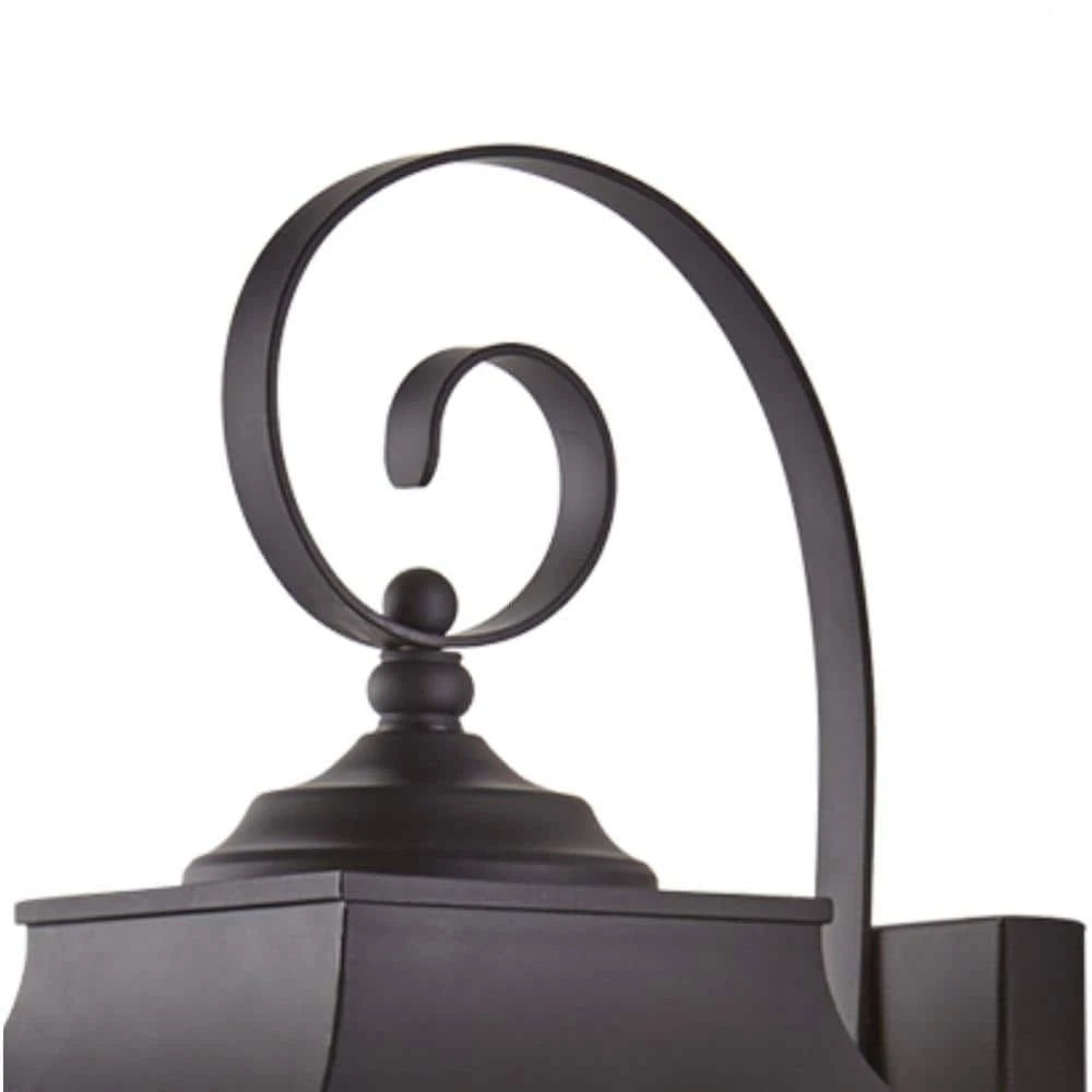 The Scroll Collection from Home Decorators exhibits transitional style exterior lighting with black finishes and clear water glass sides, designed to coordinate with a variety of home styles from modern to traditional. The Scroll 9 inch wide outdoor wall light is the largest lantern in the collection. It houses two 60-watt light bulbs, offering enough illumination for larger outdoor spaces. The square shade is open at the bottom to provide directional lighting below, and to allow for easy access to change the bulbs. The body of the fixture affixes firmly to a rectangular wall plate to hold up in harsh weather conditions, and the piece includes a decorative scroll arm- a feature that is present throughout the collection. Scroll wall lights look beautiful with the lights on and off, and are ideal for illuminating driveways, porch entryways, walkways, and landscaped areas.