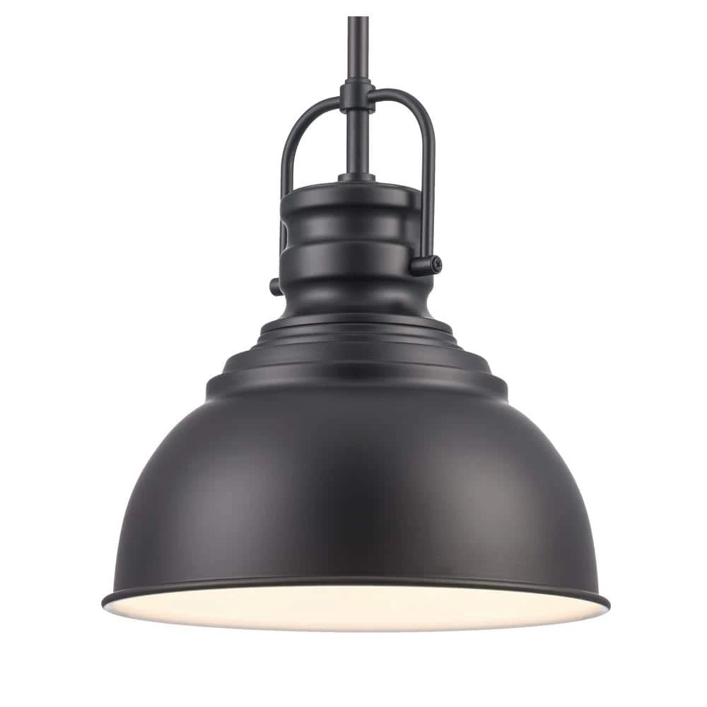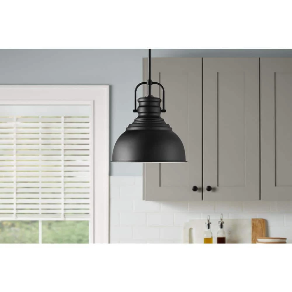 The Shelston Collection from Home Decorators presents industrial style indoor lighting with rustic farmhouse appeal, ideal for a variety of home styles from traditional to contemporary. Enhance your entryway, kitchen or dining room with the updated styling of the Shelston family of ceiling lights. The 10 in. round pendant is the smallest in the collection and is finished in black, offering a classic look and feel while remaining neutral enough to coordinate with existing decor. The metal dome shade is open at the bottom to allow ample illumination from the 60-Watt bulb inside to brighten your home. The piece mounts to a black ceiling canopy and includes several matching black extension rods for a customizable height. Shop the Shelston Collection for additional sizes and finish options.