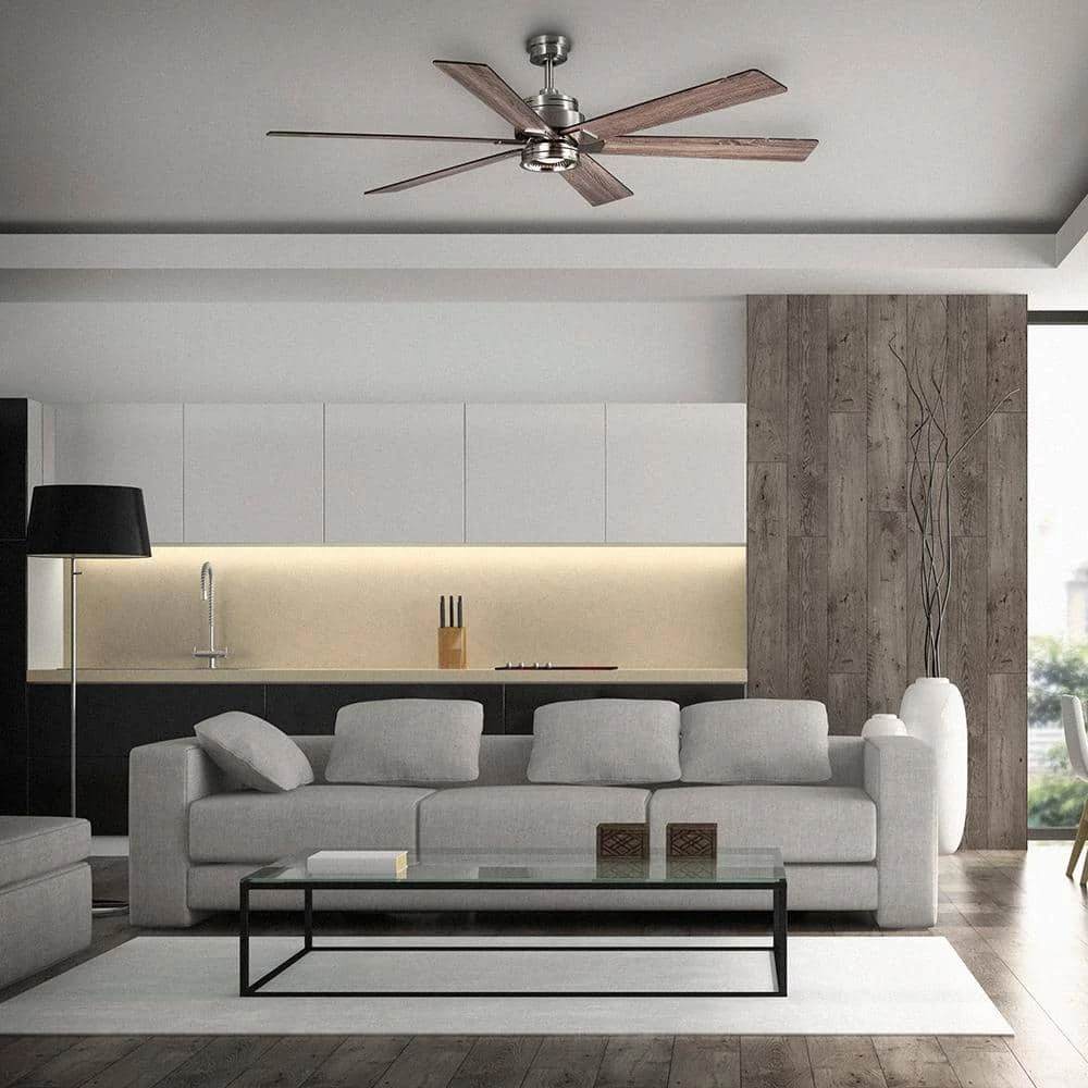 Cool down any large room with the 70 in. Statewood ceiling fan from the Home Decorators Collection. This ceiling fan features a modern light kit, brushed nickel finish and six reversible, matte black/gray wash blades that complement many decors. It’s easy to get the perfect settings with the remote, which controls the speed functions, independent light and the Comfort Breeze feature for a natural breeze effect. The 18-W LED light is dimmable and requires no maintenance.