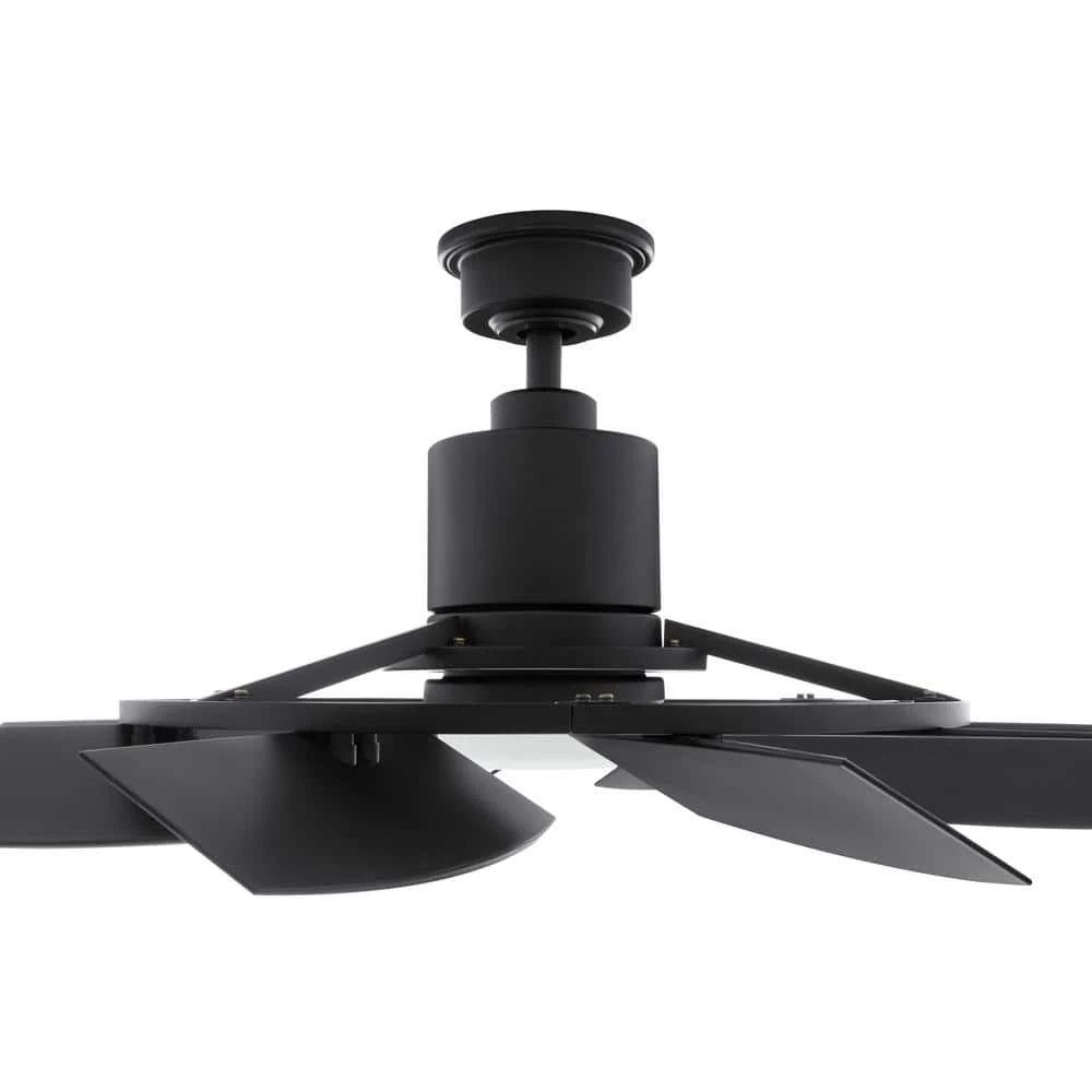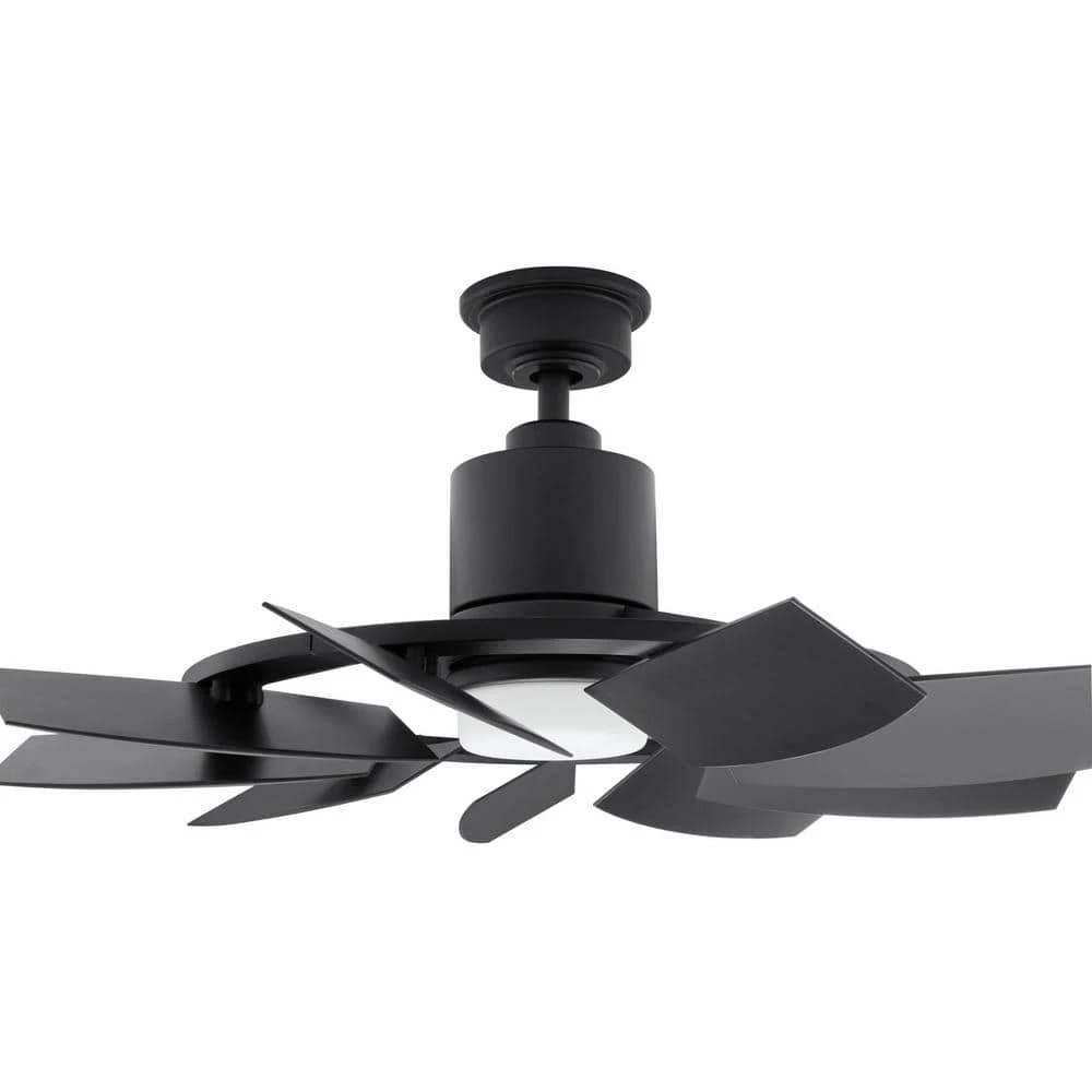The 36 in. LED Indoor/Outdoor Matte Black Ceiling fan is great for small rooms and has a very unique design which will modernize any room. Also, this is damp rated and can be installed under a covered ceiling for outdoor use. The remote control will control the light and speeds and includes the batteries. This fan includes a lifetime motor warranty for peace of mind. DC motor fans are 70% more energy efficient than AC motor fans (when comparing efficiency (CFM/W) of DC vs AC motors in published FTC Energy Guides for ceiling fans).