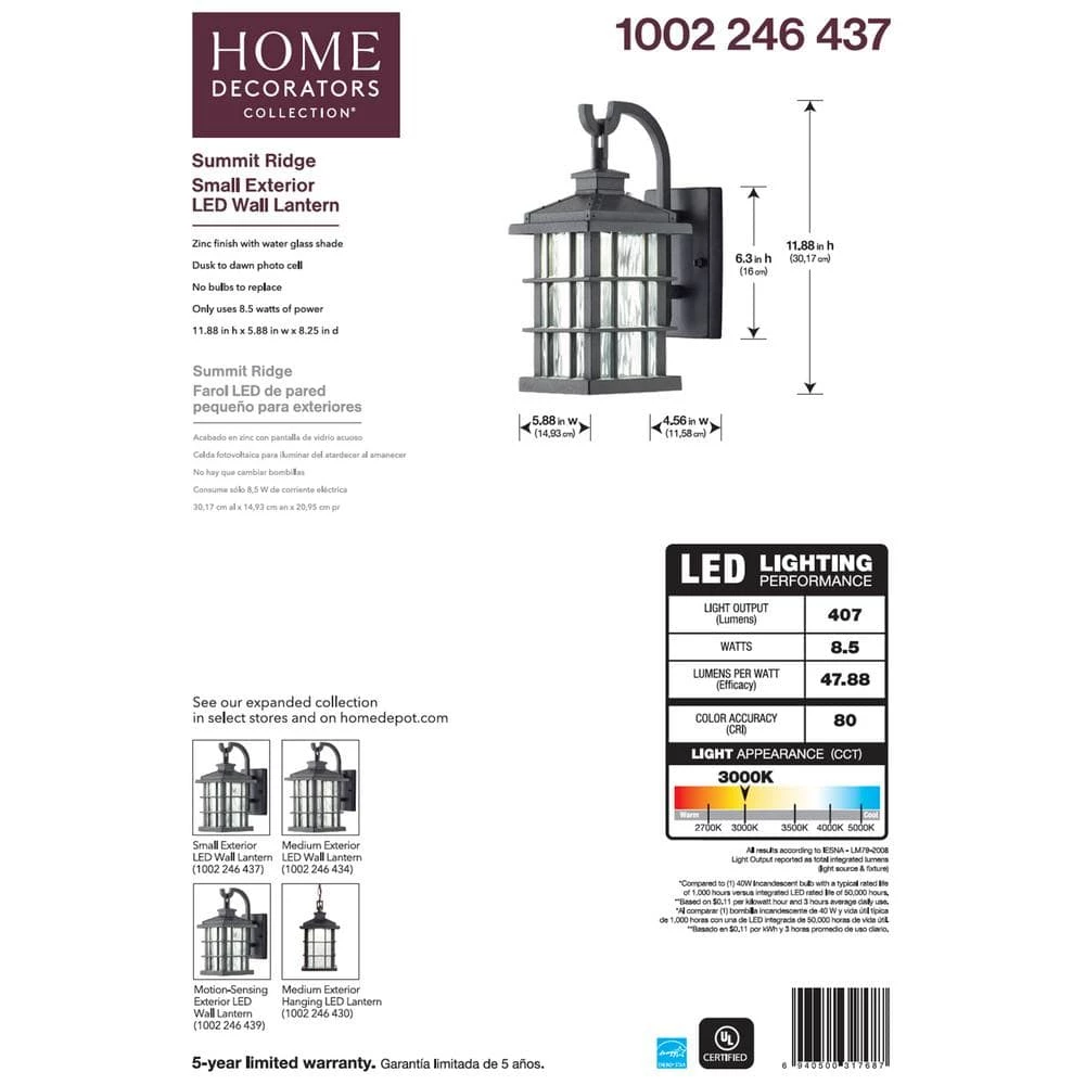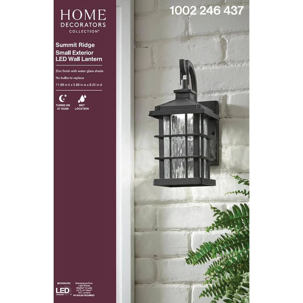 The versatile and exclusive Summit Ridge Outdoor Lantern from Home Decorators Collection features a strong, sleek frame and windowpane detailing’s. It’s inspired by the classic Arts and Crafts movement and graced with rippling water glass panels that create a warm, welcoming glow. This outdoor wall lantern comes equipped with energy efficient LEDs that provide 50,000 hours of lamp life and 407 Lumens of output. The light hue emitted is 3000K of bright white light and the lantern features an amazing dusk-to-dawn setting that allows it to turn on and off at dawn.