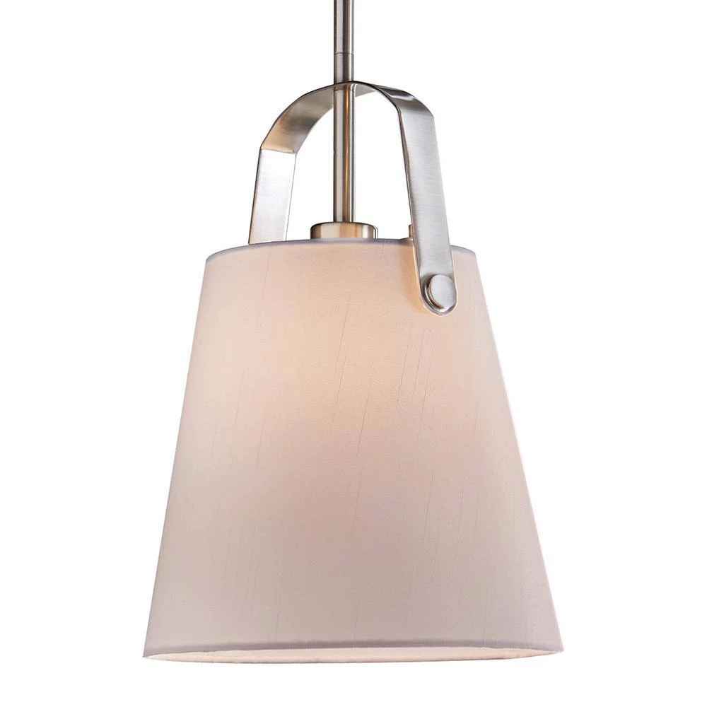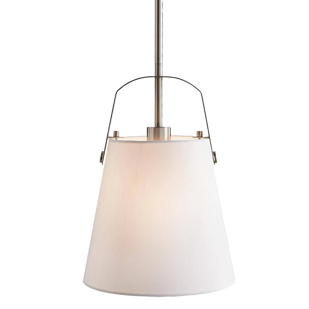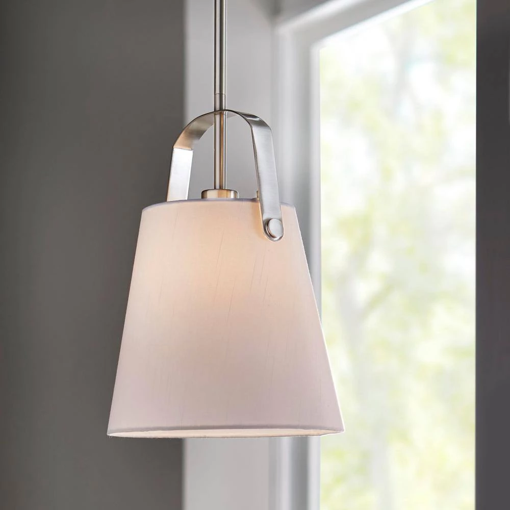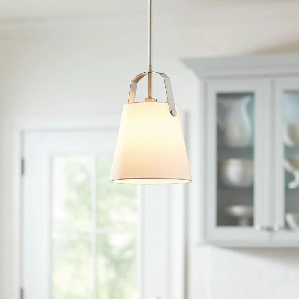 Achieve a coastal style for your interior design with this one-light mini pendant. The arched supporting frame features finely-crafted details for an enhanced sense of architectural styling. Pairing exceptionally well with farmhouse-style kitchens, a white linen fabric shade and brushed nickel finish highlight this pendant light. Display as single light or grouping of two or more for a customized lighting design in your home. Measuring 10 in. dia. x 14 in. H, this pendant lighting option accepts one 60-watt medium-base bulb, which is not included.