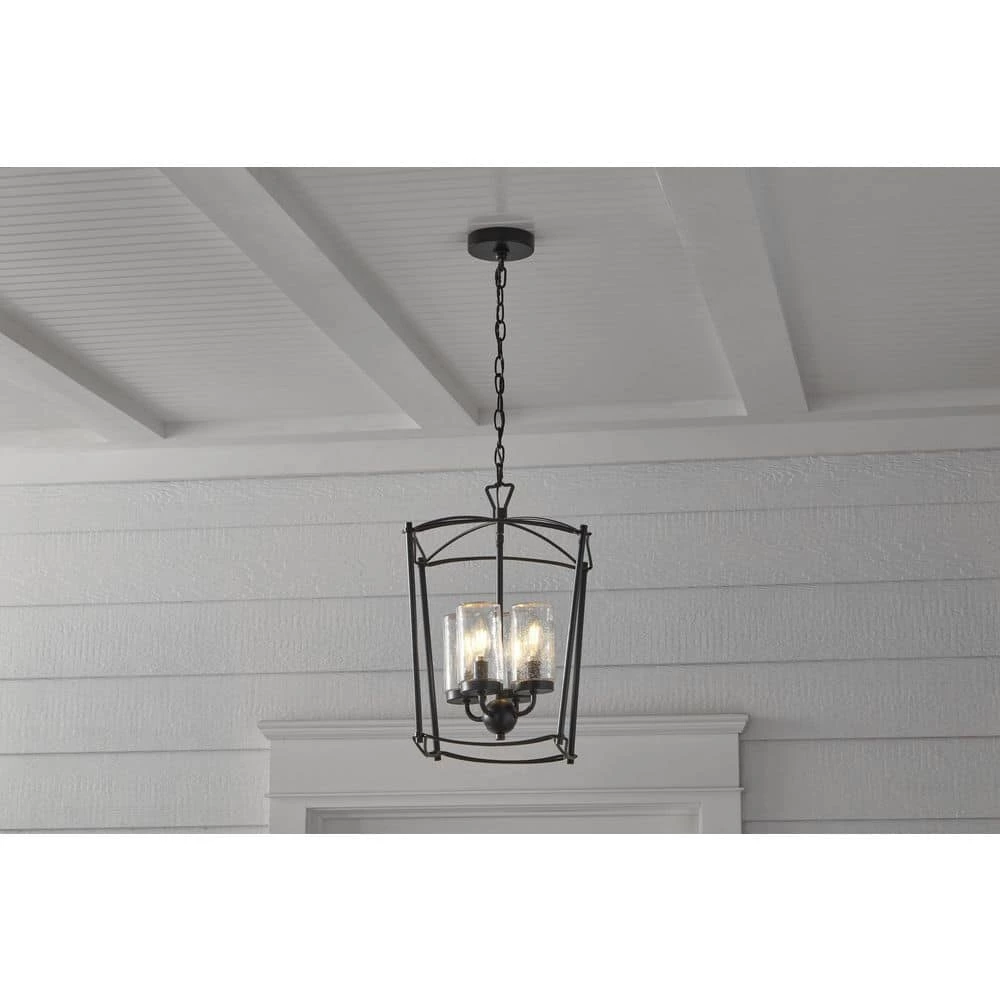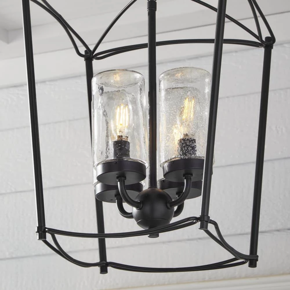 This is the perfect outdoor hanging pendant light, with a modern texture glass and a 4-light candelabra. This hanging lamp’s simple design and concealed wiring combine for a dramatic design statement. The openwork structure of this hanging light complements many decor styles and casts a soft ambient light throughout your porch, patio, gazebo, courtyard, foyer, entryway, etc. The center lamp housing features a matte black finish, and is fully dimmable. The warm blend of etched glass shades and iron metalwork create a new design trend and add a distinct design flair to your space.