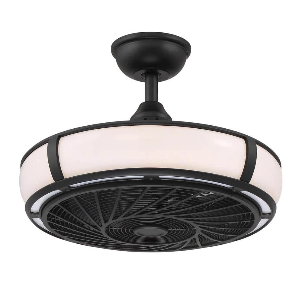 The Home Decorators Collection Tuilene Drum Style 21 in. Matte Black pendant fan will catch everyone’s eyes because of its unique design and functionality. The housing is illuminated with two 26-Watt LED light strips that are fully dimmable and will last up to 40,000-hours. Also, it comes with a remote control that can independently control the light brightness and speed of the fan, battery included.