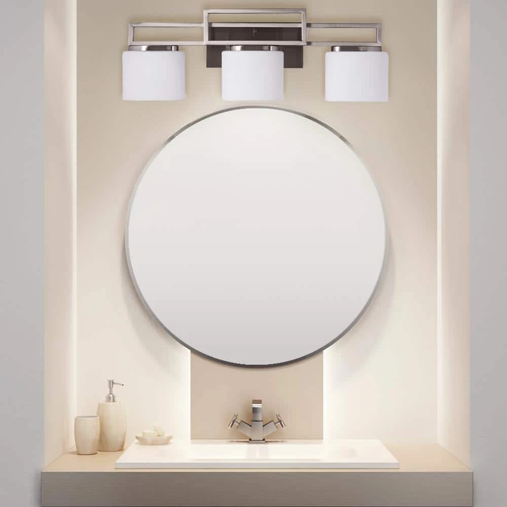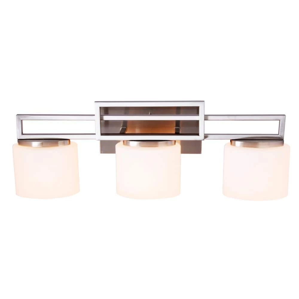 Three oval shaped, opal glass shades compliment decorative bars finished in brushed nickel, enhancing the design of this unique Vanity Light Bar. Its clean lines lend the perfect touch to a residence in need of a refresh. Whether you prefer modern or transitional decor, this fixture rewards a bathroom with functional lighting ideal for applying makeup or shaving. Updating the lighting in your home is the most effective way to accomplish a striking, yet simple, DIY remodel.