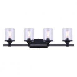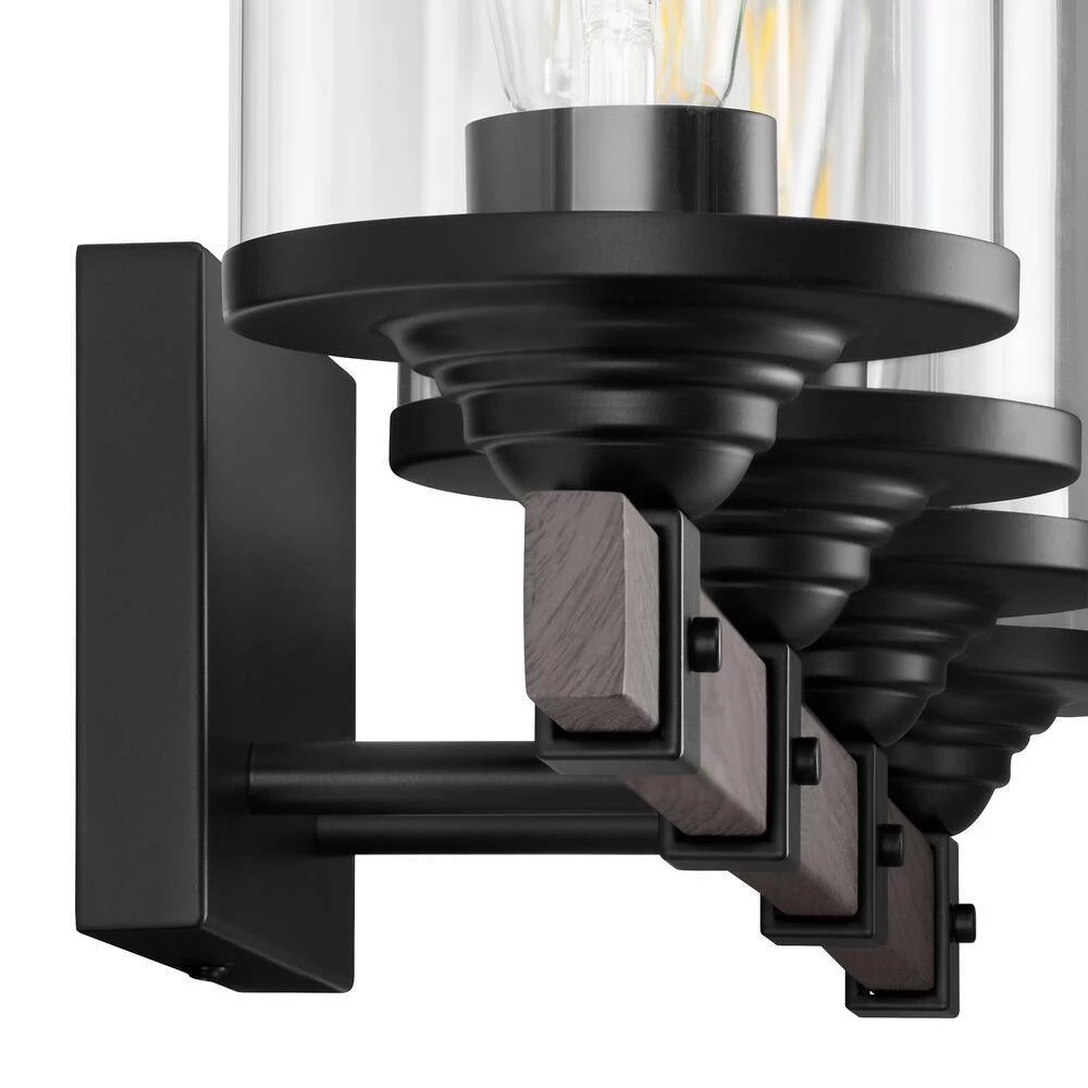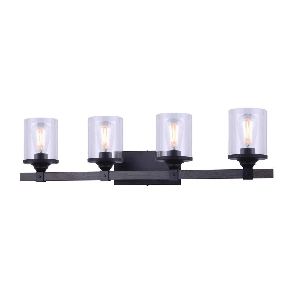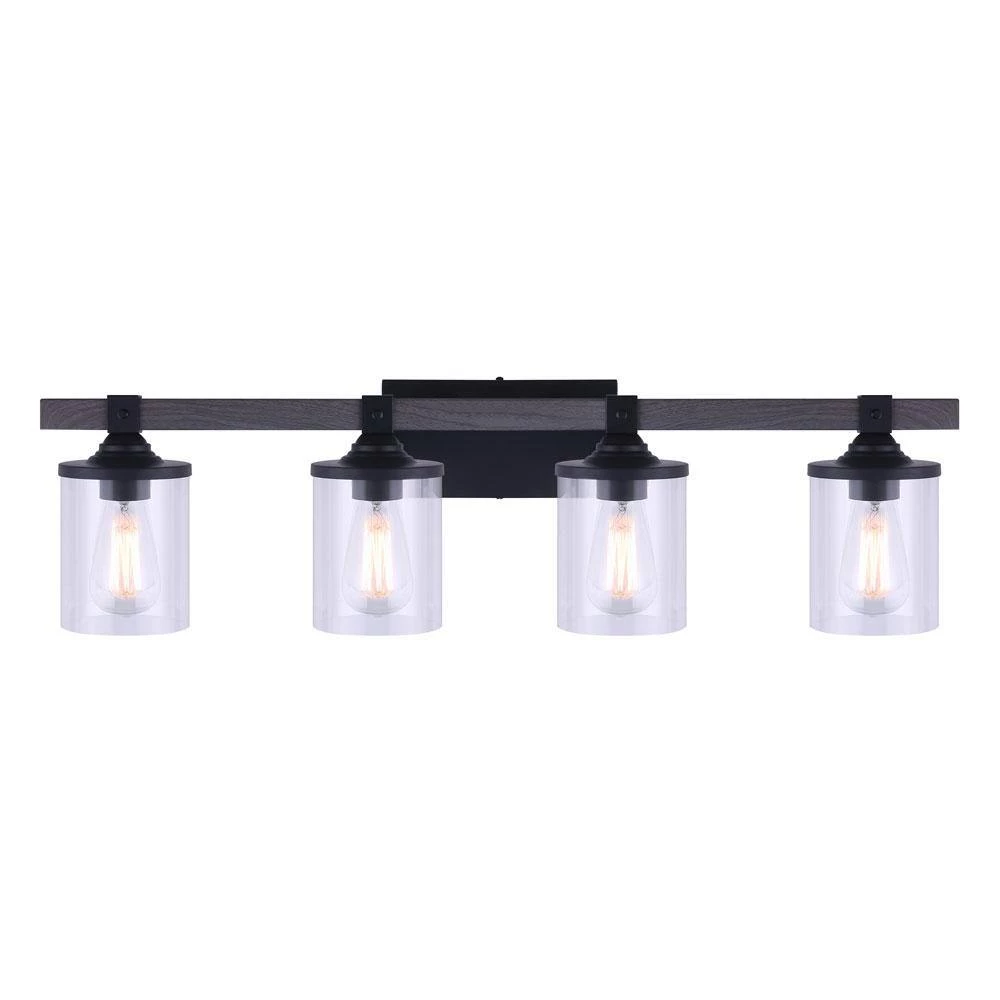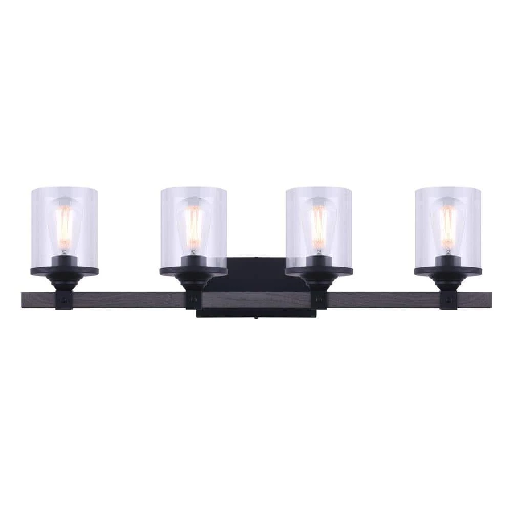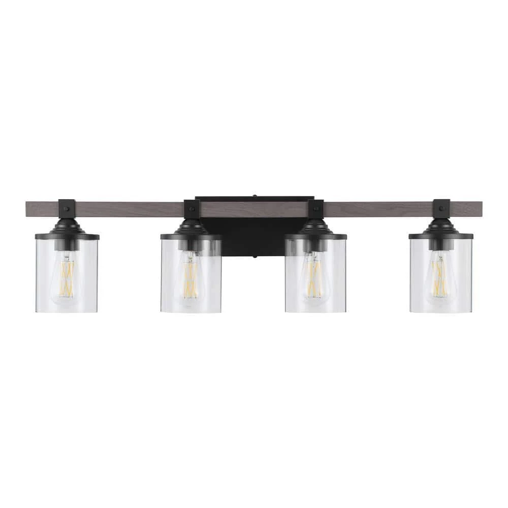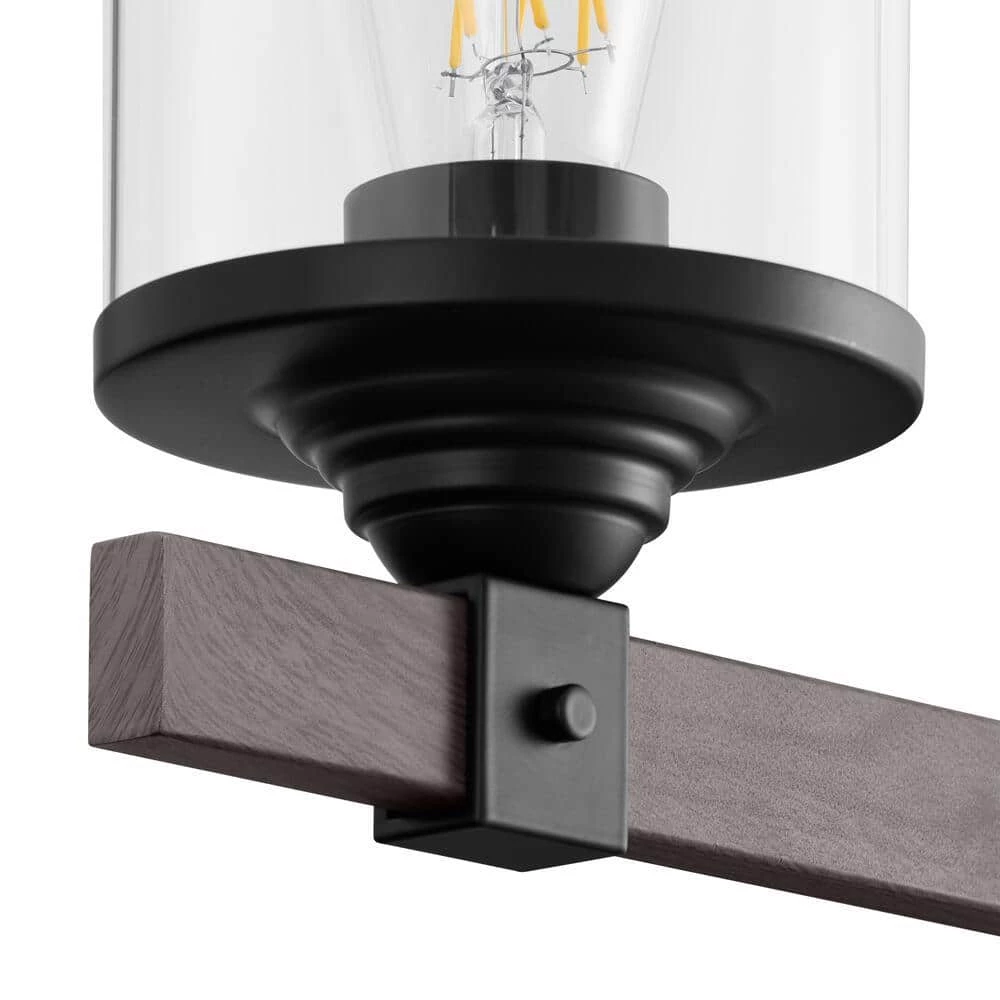Refine your space with this Tyson 4-Light Matte Black and Faux Wood Vanity Light with Clear Glass Shades. It can be set up as an up or down light to fit your preference. Easily add this to a space to give it that modern farmhouse appeal. It also works well with other design schemes. You’ll notice that the cylinder-shaped clear glass shades add a unique quality.