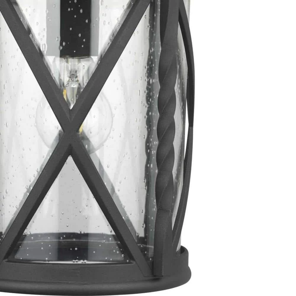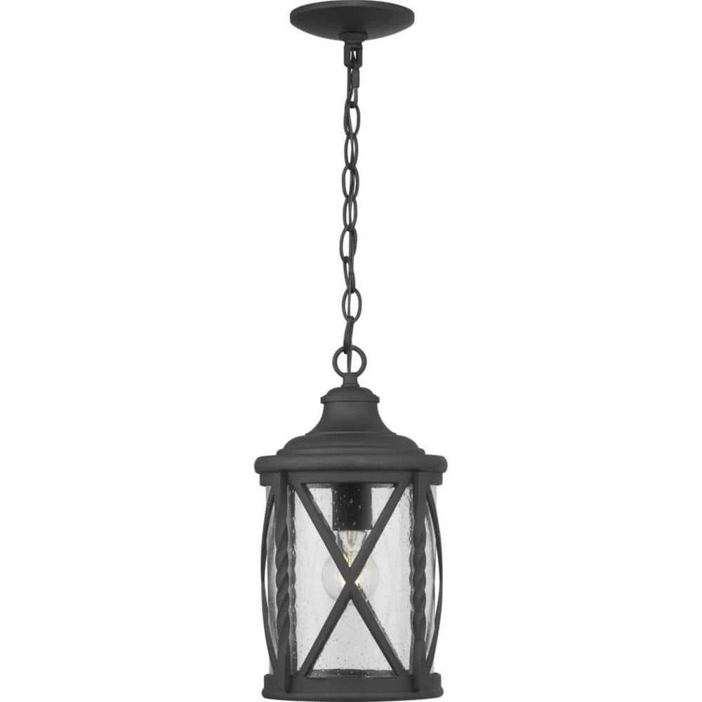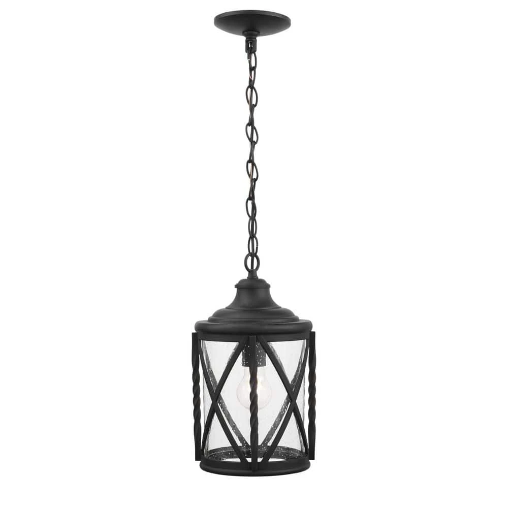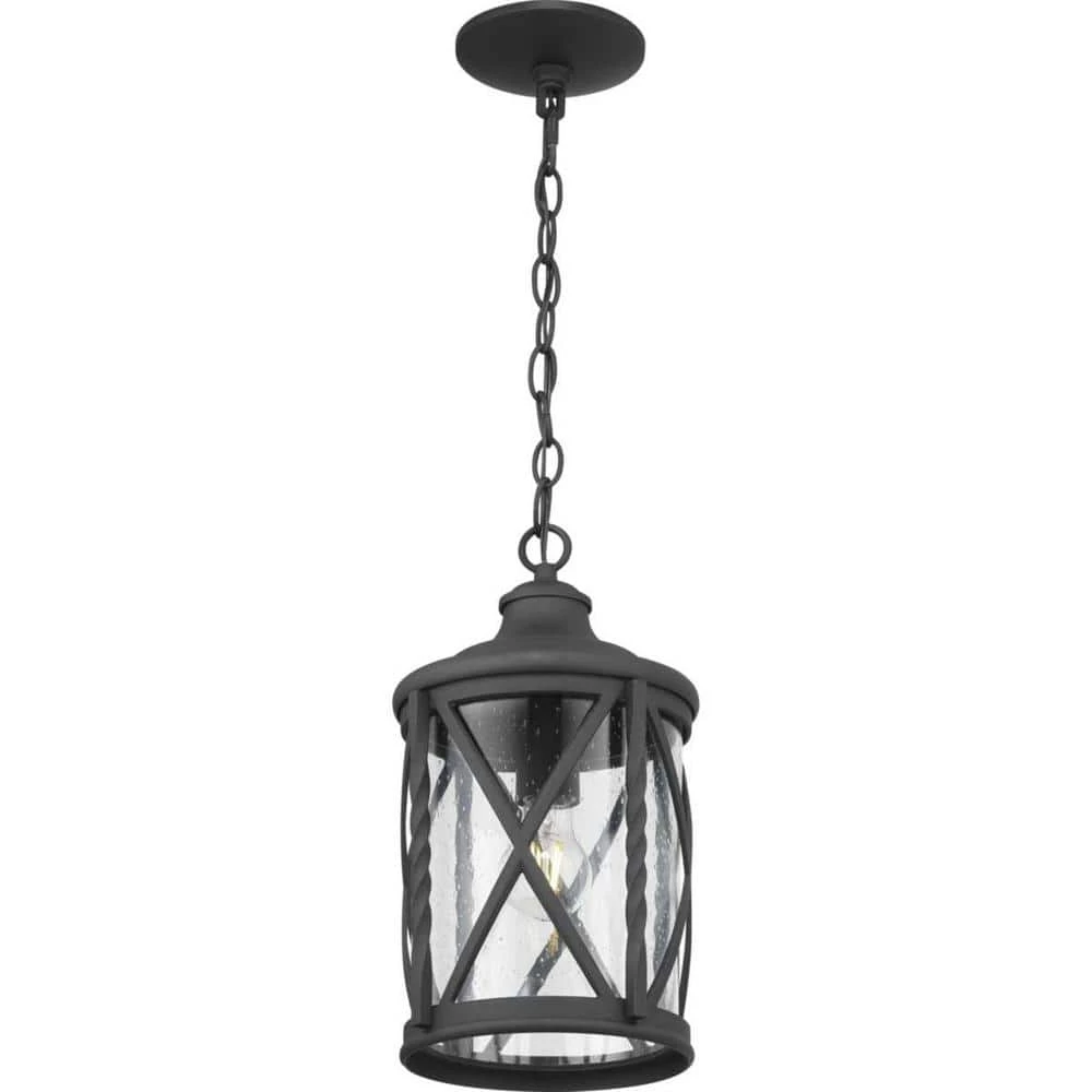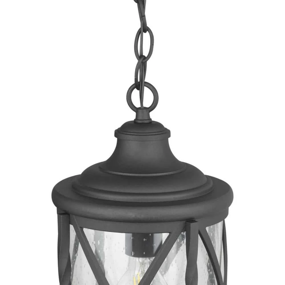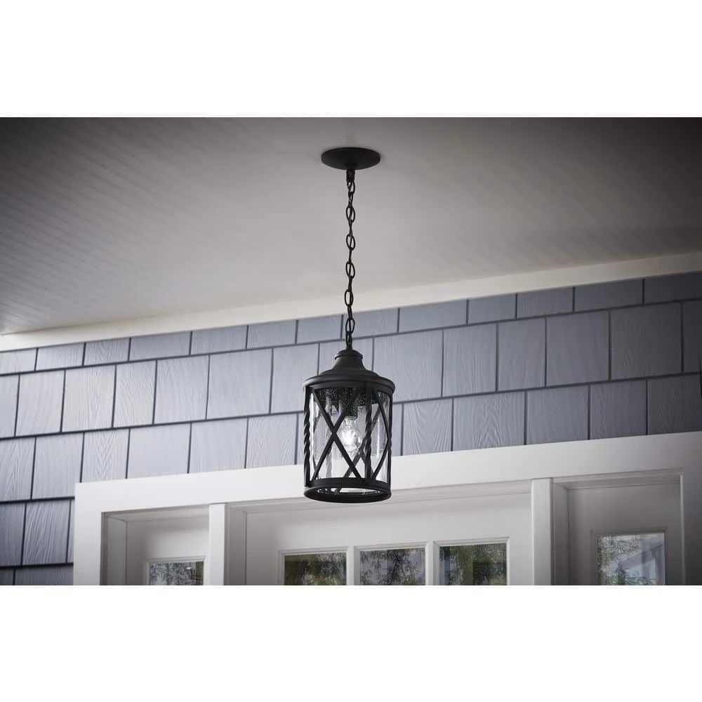 Enhance your home’s curb appeal with the Walcott Manor hanging lantern. Finished in black, a peaked canopy offers a classic touch while scrolled and linear details on the elongated frame bring transitional style. Soft light glows from clear seeded glass panels. Enjoy this lantern on a covered porch, patio or other covered outdoor living space.