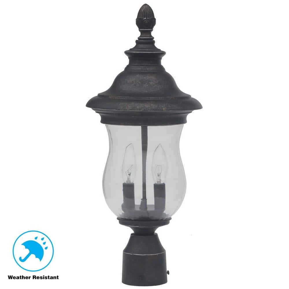 A lovely addition to any home’s exterior design, the exclusive Wesleigh Post Mount Lantern from Home Decorators Collection features sculpted die-cast aluminum in a hand-applied bronze finish for a traditional look. This timeless outdoor light fixture features a clear ribbed water glass shade that offers illumination with two 40-Watt candelabra bulbs (sold separately).