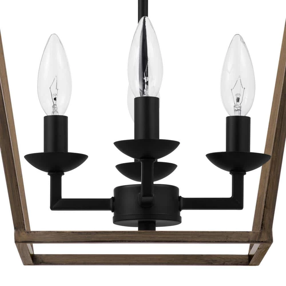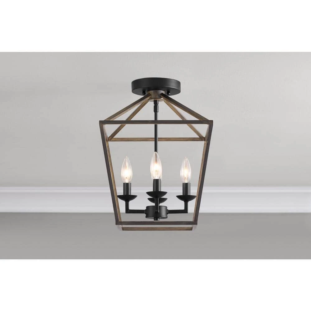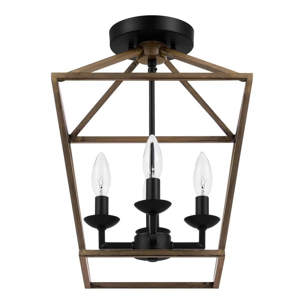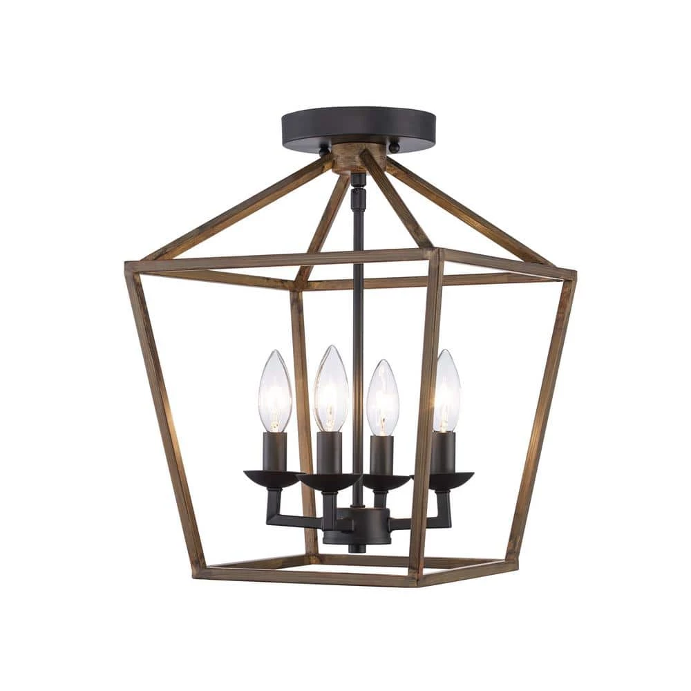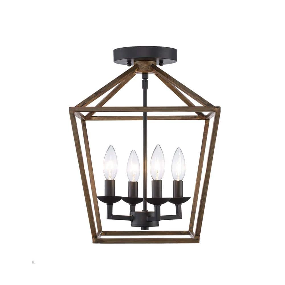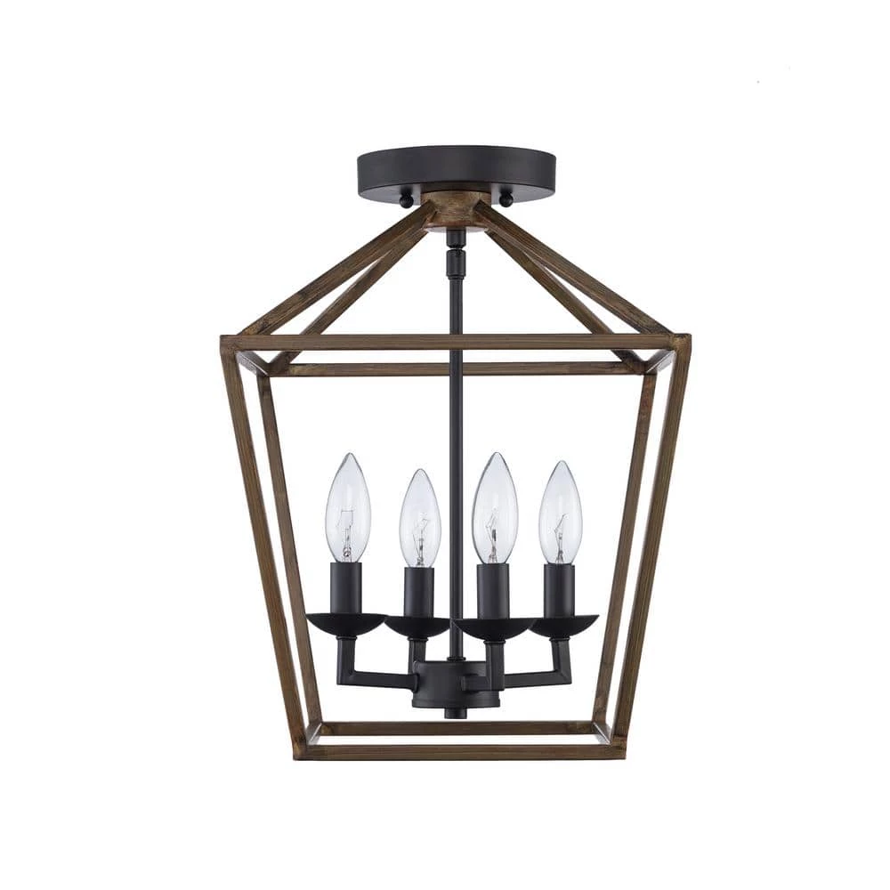 The Weyburn Collection exhibits farmhouse style indoor lighting with rustic, industrial appeal. Enhance your entryway, kitchen or dining room with the classic styling of this 4-light semi flush mounted ceiling light. Highlighted by a contemporary black finish and faux wood metal birdcage design, this fixture adds a warm glow to a variety of indoor spaces. The open caged shade exposes the candelabra style bulbs for a classic look, perfect for providing ample task lighting in a variety of indoor applications. This semi flush fixture includes a matching round ceiling plate for mounting. Shop the Weyburn Collection for additional finish options and light counts.