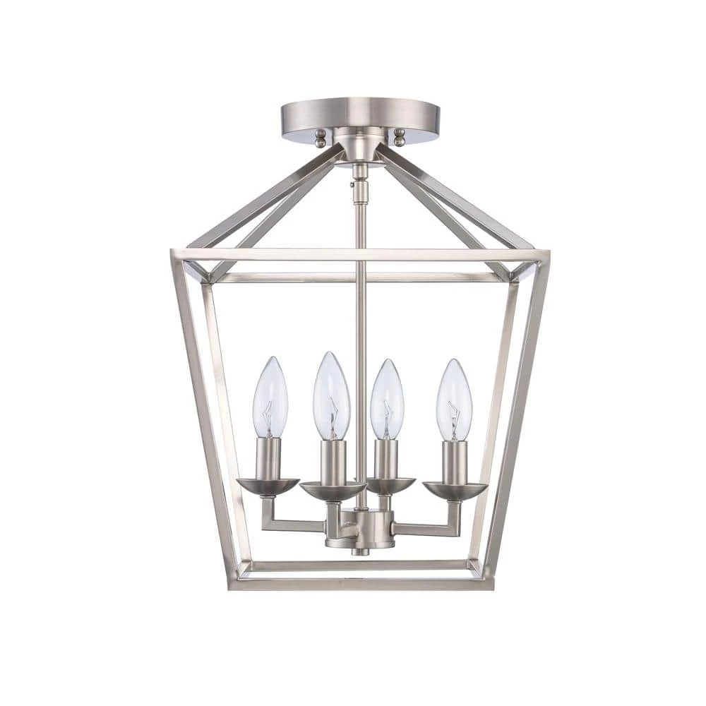 The Weyburn Collection exhibits farmhouse style indoor lighting with rustic, industrial appeal. Enhance your entryway, kitchen or dining room with the classic styling of this 4-light semi flush mounted ceiling light. Highlighted by a contemporary metal birdcage design and brushed nickel finish, this fixture adds a warm glow to a variety of indoor spaces. The open caged shade exposes the candelabra style bulbs for a classic look, perfect for providing ample task lighting in a variety of indoor applications. This semi flush fixture includes a matching round ceiling plate for mounting. Shop the Weyburn Collection for additional finish options and light counts.