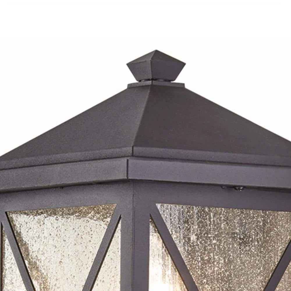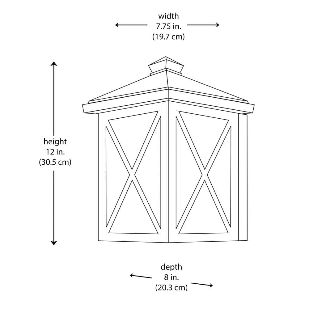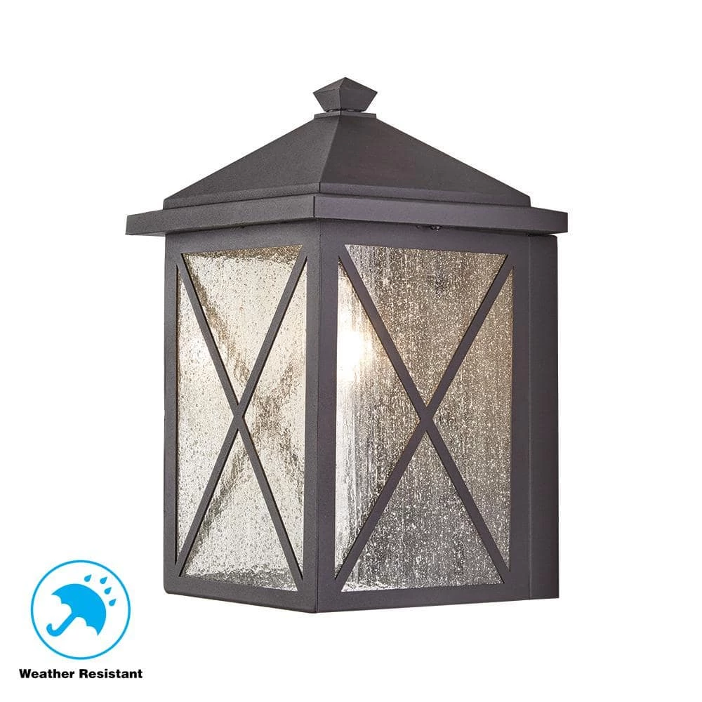 The Wythe Collection from Home Decorators Collection features transitional style outdoor lighting suitable for a wide variety of home styles, from farmhouse to traditional. The Wythe 12 inch tall outdoor wall mounted light is largest in the collection and extends 8 inches out from the wall. The piece is finished in black to coordinate with existing home styles and features seeded glass on three sides. The farmhouse style is carried throughout the fixture with a sloped roof, carved decorative finial, and criss-cross metal decoration on the glass. A single 60-watt bulb is shaded by seeded glass, allowing for maximum light output in landscaped areas and walkways. The wall light is open at the bottom to provide directional lighting over porch entryways and decks. Shop the Wythe Collection for additional coordinating exterior pieces.